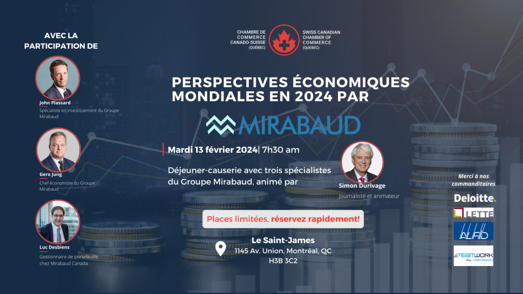 Dans cet éditorial, nous ne pouvons pas passer sous silence les événements belliqueux qui se passent dans le monde et qui se font sentir sur l’économie mondiale, notamment en raison des hausses de prix et des difficultés d’approvisionnement. À ce propos, nous profitons de vous proposer perspectives économiques mondiales en 2024 par Groupe Mirabaud, le 13 février de 07:30 – 09:00, préparez-vous à plonger au cœur des perspectives économiques de 2024 avec Le Groupe Mirabaud, leader de la gestion de patrimoine pour les particuliers & entrepreneurs et ses trois intervenants M. John Plassard, M Gero Jung et M. Luc Desbiens lors d’un déjeuner-conférence incontournable au Club Saint James présenté par Simon Durivage.